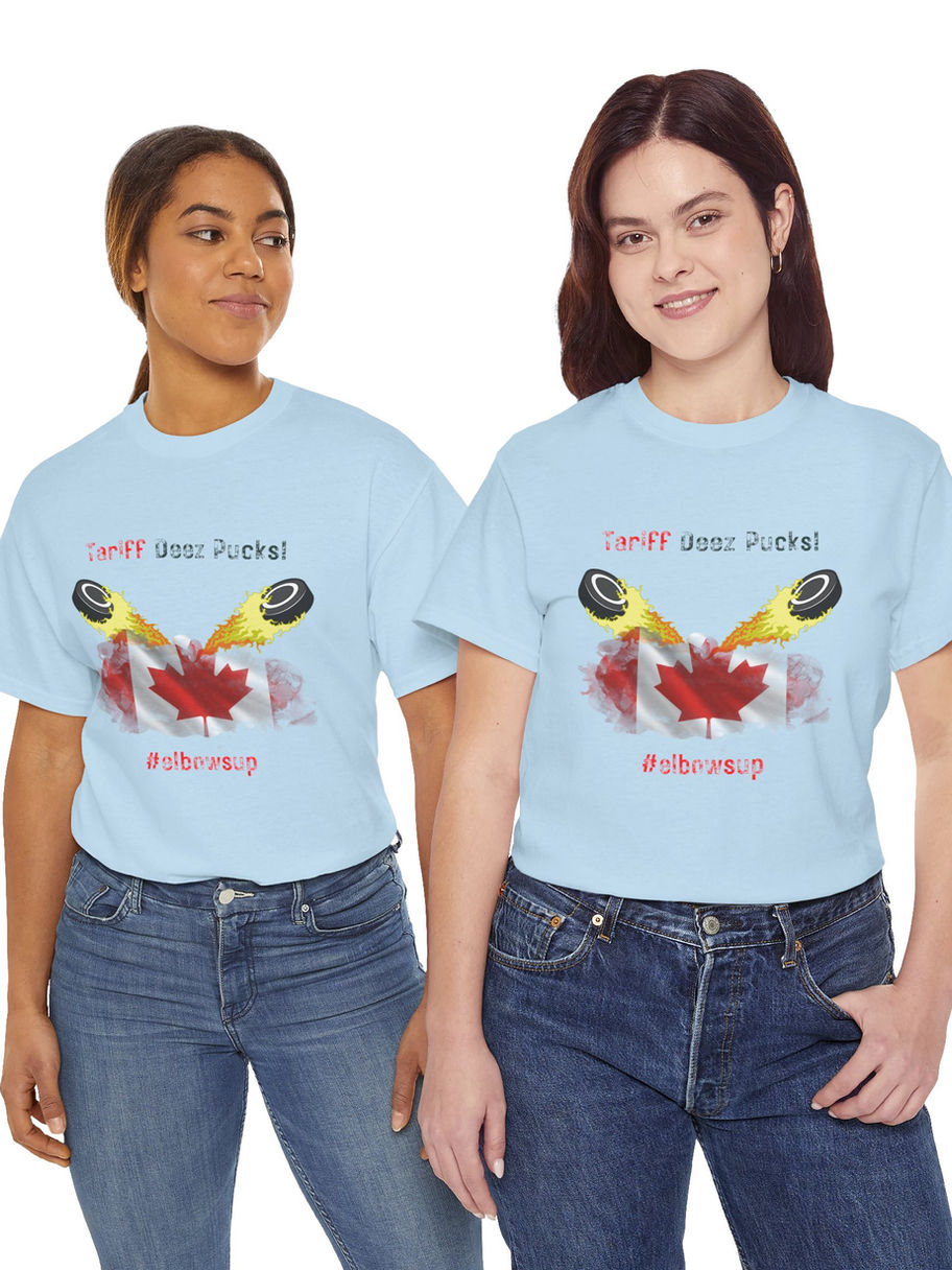 Canadian Patriotic Unisex Tee, USA Trade War, #elbowsup, "Tariff Deez Pucks"
