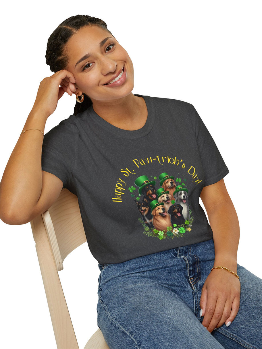 This St Patrick's Day themed unisex T-Shirt features a variety of dog breeds celebrating with festive trimmings and accessories. The shirt is playfully captioned 'Happy St Paw-Trick's Day', making it perfect for dog lovers looking to join in the holiday spirit.